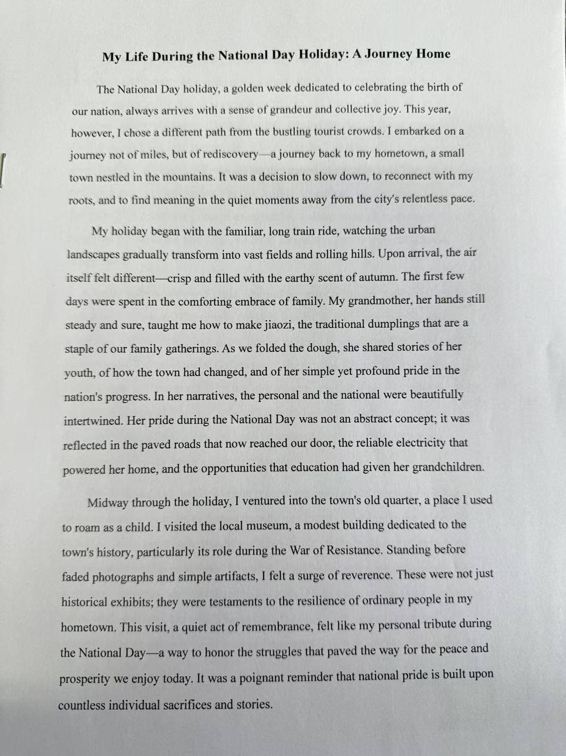为丰富学生文化生活,提升学生英语写作能力与跨文化表达素养,国际教育学院近期举办了以“My life during the National Day holiday” 为主题的英文征文比赛。活动自启动以来,得到了全院学生的积极响应与热情参与,最终共征集到 20 余篇高质量参赛作品。