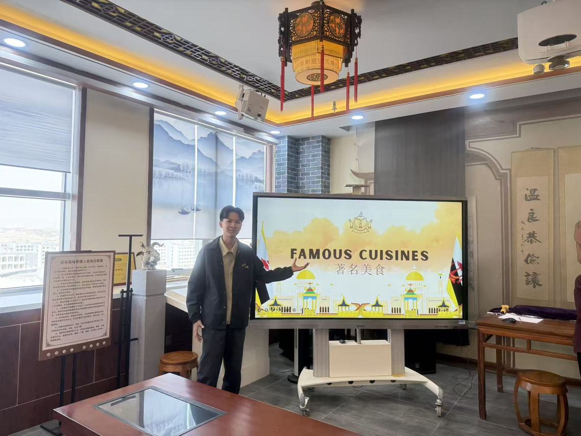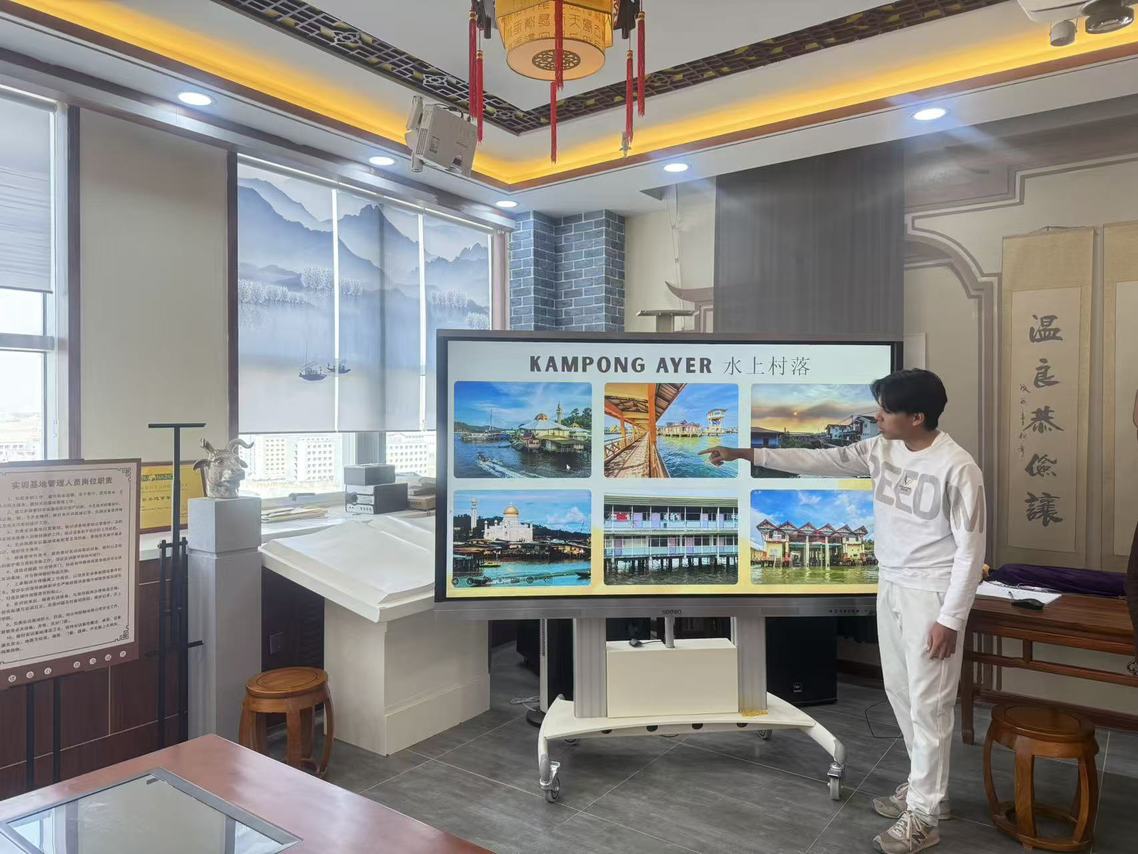 活动伊始,学院指导教师介绍了此次活动的背景与意义,强调开展学生文化交流活动,既是对两国友好关系的传承,也是推动文明互鉴、培育跨文化沟通能力的重要举措。随后,活动进入核心分享环节,文莱留学生与中国学生依次化身“文化导游”,带来了一场跨越山海的文化盛宴。在文莱文化分享环节,10名文莱学生组成宣讲团,分板块详细介绍了本国的自然环境与风土人情,让在场中国学生全方位领略了这座南洋岛国的独特魅力。在自然环境介绍中,留学生们重点分享了甘邦阿逸水上村落的风貌,讲解了这座世界上最大水上居住区的建筑特色与居民的生活习俗,让大家对文莱“水陆相依”的居住文化有了直观认知。在风土人情展示中,文莱学生现场演示了传统服饰Baju Melayu和Hijab的穿戴礼仪,细致讲解了服饰背后的文化内涵;同时,文莱学生还教中国学生文莱传统问候礼仪,互动间拉近了彼此距离。
