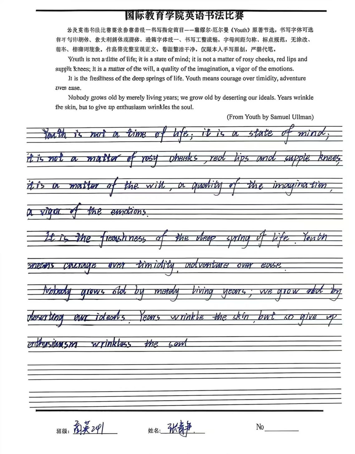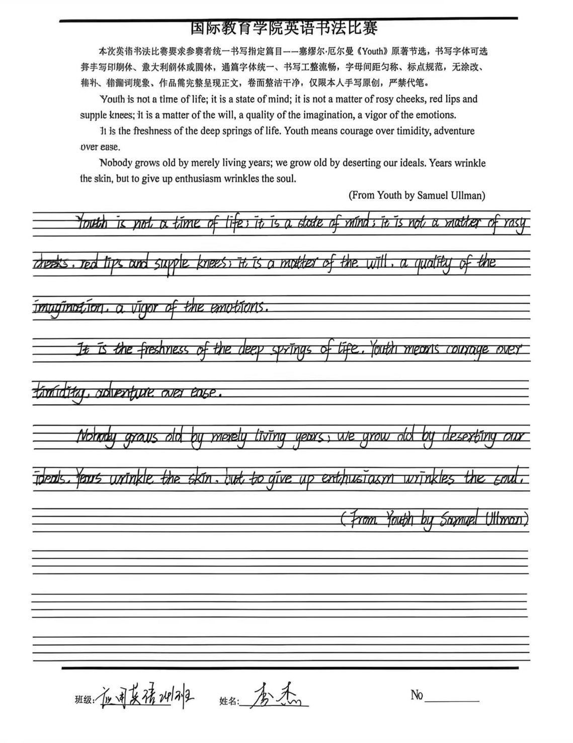 本次比赛明确了书写规范与作品要求,引导学生以认真严谨的态度完成书写,充分展现扎实的英语书写基础与良好的学习风貌。学院评审小组从书写规范、整体美观、卷面整洁等方面公平评审,评选出多份优秀作品。